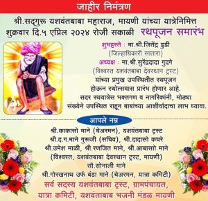 असंख्य भाविकांचे श्रद्धास्थान असलेल्या मायणीच्या सद्गुरु यशवंत बाबा यांच्या ९३ व्या पुण्यतिथी निमित्ताने आज शुक्रवार दि. ५ एप्रिल २०२४ रोजी रथ सोहळ्याचे आयोजन करण्यात आले आहे.